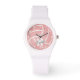 Diese sportliche Volleyballuhr ist mit einer minimalistischen Volleyballgrafik (die nur durch die weißen Nähte des Volleyballs dargestellt wird) ausgestattet, die eine rosa, schicke, digital kreierte Textur - mit ihrem Namen und ihrer Monogramm- oder Jerseynummer - von katz_d_zynes überträgt