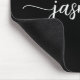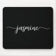 Girly Black Moderne elegante Minimalistische Monogram Name Signature Script Custom Personalisiert Mousepad. Diese Design mit Ihrem Vornamen in einem hübschen handgeschriebenen Stil Swash Schwanz Schriftart Typografie in Weiß auf schwarzem Hintergrund. Diese lassen sich einfach anpassen. Grosses, stilvolles Frauengeschenk zum Geburtstag, Muttertag, Brautparty, 16. Geburtstag und es ist für das Mädchen, das einzigartige, minimale Stilelemente Lieben.