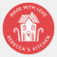 Ein personalisierter Aufkleber "made with Liebe" mit einem niedlichen, weißen Lebkuchenhaus mit Herz und Worten, mit Liebe auf rotem Hintergrund. Personalisieren Sie es, indem Sie Ihren eigenen Namen hinzufügen. Eine hübsche Touch für all Ihre hausgemachten Geschenke. Entworfen für Sie von BlackBerry Boulevard.
