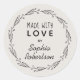 Personalisiert Made mit Liebe Wreath Neutral Eggshell Product Label Round Aufkleber... Ein stilvoller schwarz-eggshell-Rundaufkleber für Ihre handgefertigten Geschenke, Zuhause-Backwaren oder hausgemachte Produkte zum Verkauf. Ein Botanischer Kranz der Linie grenzt an den Text, der "Made with Liebe by" lautet, gefolgt von Ihrem Namen in trendiger Schrifttyp. Auf einfache Weise können Sie den Namen in Ihre eigene Persönlichkeitsvorlage ändern.