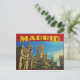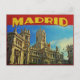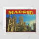 Diese wunderschöne Vintage Optik-Szene zeigt Gebäude in Madrid, Spanien mit dem Namen der Stadt auf der anderen Seite in gelb auf einem roten Hintergrund.