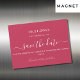 Eine moderne und elegante Save the Date Magnetkarte für eine Hochzeit. Ein magentafarbener Hintergrund. Personalisieren und fügen Sie ein Datum und Namen hinzu. Der Text: Save the Date ist mit einem großen angesagten, handgeschriebenen Stilskript geschrieben.