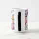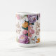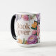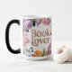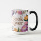 This Morphing Mug features a decorative floral design with the text Book Lover in metallic rose gold 3D letters centered in the image. The text is surrounded by an elegant arrangement of flowers including peonies, white lilies, pink roses and golden marigolds. The image is on both sides of the mug. The morphing mug displays the image when a hot liquid is put in the mug. The mug is made with strong ceramic construction. The mug shown in the image is a fifteen ounce morphing mug.