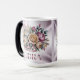This Morphing Mug features a decorative zodiac design with the Libra Glyph centered in an elegant floral arrangement. The Libra symbol is in metallic rose gold. The floral bouquet contains large peonies in beige, silver and dusty rose colors, with a burgundy rose and a magenta flower bud. The arrangement includes delicate green eucalyptus leaves, golden fern fronds and small burgundy accent flowers. The flowers are painted in a watercolor style with subtle color variations. The word LIBRA appears at the bottom of the design in large, elegant rose gold capital letters with a subtle gradient effect. The pretty image is on both sides of the mug. You can see the image after you put a hot drink in the mug.