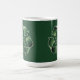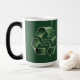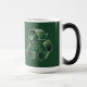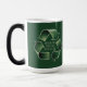 This Morphing Mug features the classic recycling symbol on a forest green background. The recycling symbol consists of three curved arrows forming a continuous loop, arranged in a clockwise direction. The arrows are in metallic green with a glossy, reflective surface that creates highlights and shadows. The arrows have a subtle gradient effect, transitioning from lighter green at the edges to darker green in the center. In the center of the recycling symbol, there is green text that reads REDUCE REUSE RECYCLE in all capital letters, positioned within the triangular area formed by the arrows. The image is on both sides of the mug. When you put a hot drink in the mug the image will be visible.