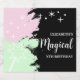 Magical kids birthday with stars and bubbles coming from a star shaped wand against a light pink and mint green background.