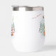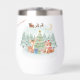 A charming Christmas illustration featuring a fox and a deer in front of a decorated Christmas tree, while Santa Claus flies across the starry sky with his sleigh and reindeer.