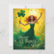 Eine fröhliche, rot-haarige Frau in einem eleganten grünen Kleid tanzt voller Lebensfreude vor einem hellen, goldgelben Hintergrund. Sie hält ein großes vierblättriges Kleeblatt in der Hand, während kleine Kleeblatten in der Luft um sie herum schweben. Die Szene strahlt Energie, Glück und Feier aus, passend zum St. Patrick's Day.