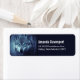 Adressieren Sie Labels mit einem Bild eines magischen mystischen Wolfs, der in einem Wald stehend ist, der sanft schneebedeckt ist. Es sind auffallende blaue Augen, die wirklich Ihre Aufmerksamkeit erregen.