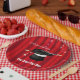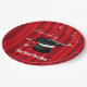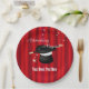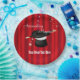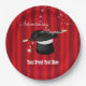 Eine grafische Abbildung eines Zauberhutes mit rotem Vorhang von Künstler/Designer Charmaine Paulson auf Party-Tellern. Die Teller haben Vorlagen für Ihre Personalisierung.
