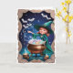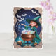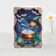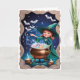Erleben Sie die Magie Halloween mit dieser bezaubernden Illustration einer jungen Hexe, die in ihrem Kessel unter einem mondbeleuchteten Himmel einen Tränke braut, umgeben von fliegenden Fledermäusen.