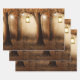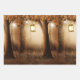 Papierblätter mit einer skurrilen, bezaubernden Illustration in kräftigen braun-gelben Farben. Ein magischer mystischer Wald mit einem großen Baum, der eine alte Laterne hält. Luftlichter tanzen überall herum. Ein bezauberndes, wunderbares Design.