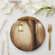 Papier Teller mit einer skurrilen, bezaubernden Illustration in Braun- und Gelbtönen. Ein magischer mystischer Wald mit einem großen Baum, der eine alte Laterne hält. Luftlichter tanzen überall herum. Ein bezauberndes, wunderbares Design.