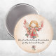 Nähen thematischer, runder Kühlschrankmagnet mit süßer Abbildung von Engeln gekleidet in einem farbenprächtigen Flickwerk Motiv und Blume Akzent. Kann bearbeitet werden, um mit Ihrem eigenen Text zu personalisieren. Wählen Sie aus 3 Größen.