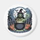 Eine Abbildung einer Hexe, die einen Zaubertrank in einem großen Kessel unter Vollmond umwirbelt. Umgeben von Kürbissen, Fledermäusen und einer unheimlichen Halloween-Atmosphäre.