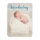 "Introduction" à la main lettrage et calligraphie script police en bleu, avec photo verticale du nouveau-né. Faire-part de naissance élégante et moderne.