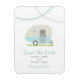Enregistrez l'aimant mariage date avec une illustration de la remorque vintage bleue avec une boîte de fenêtre pleine de fleurs. Bleu et grise au sommet. Recherchez les articles correspondants chez Jill's Paperie.