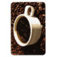 Cet aimant flexible affiche une tasse de café fraîchement moulu à la vapeur, blanc, sur un lit de grains de café rôtis brun foncé.