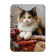 L'art de l'aimant flexible avec une peinture d'un beau chat calico dans une scène hivernale entourée de baies rouges, de pinèdes et de tissus douillets.