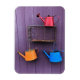 Canettes d'arrosage mignonnes et colorées contre un mur en panneau de bois peint violet. Décor de jardin très mignon et créatif !