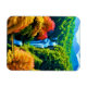 Une cascade chinoise sereine nichée au coeur d'une nature magnifique, entourée d'arbres colorés et de montagnes.