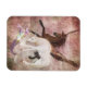 Un tableau numérique d'un Pegasus brun, une licorne blanche et un cheval de sirène coloré (Hippocampus), sur un arrière - plan texturé brun, rose et vert.