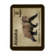 Un autre dans la série de timbres-poste pour une hypothétique nation indépendante de l'Alaska. Comprend une peinture numérique d'un ours Kodiak sur un parchemin neutre, ou vieux papier, arrière - plan. Le texte "Alaska", "Postage 8 Nuggets" et Kodiak Bear Ursus arctos middendorffi" apparaissent également. L'Ours de Kodiak (Ursus arctos middendorffi), une sous-espèce de l'ours brun, ou grizzli, est le plus grand ours du monde. Un mâle adulte peut mesurer plus de 10 mètres de haut lorsqu'il est debout sur ses pattes postérieures et peser plus de 1500 livres - un spectacle à voir. Un ours du zoo de Bismarck, dans le Dakota du Nord, aurait pesé jusqu'à 2 400 livres. Les ours vivent sur les îles de l'archipel Kodiak de l'Alaska. Aujourd'hui, il y a environ 3500 ours kodiak et leur nombre augmente en raison de l'état généralement excellent de leur habitat, y compris un poing suffisant pour se nourrir. Ils sont appelés "takuka-aq" en Alutiiq, la langue maternelle du peuple dans cette région. On pense que les ours y ont été isolés depuis la fin de la dernière ère glaciaire, il y a plus de 12 000 ans. Bien qu'ils soient le plus grand carnivore terrestre leur régime alimentaire comprend de grandes quantités d'herbe, d'autres plantes et des baies. Aujourd'hui, il y a environ 3500 ours kodiak et leur nombre augmente en raison de l'état généralement excellent de leur habitat, y compris un nombre suffisant de poissons à manger. En raison de l'abondance des ressources alimentaires, les ours Kodiak ont une aire de répartition plus petite que les autres ours bruns et n'ont pas besoin de défendre les territoires. Les Alutiiq chassaient les ours pour leur nourriture, leurs vêtements et leurs outils. Des flèches, des lances et beaucoup de courage étaient nécessaires pour la chasse. Les têtes d'ours étaient généralement laissées dans le champ comme un signe de respect de l'esprit des ours.