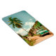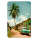 Jolie photo rétro d'une rue sablonneuse du côté de Cuba. Journée d'été avec grand palmier, femme cubaine et voiture plus ancienne américaine.