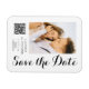 Save The Date Black White Stylish Script Modern Mariage Magnets dispose d'un arrière - plan blanc avec votre photo personnalisée. Personnalisez avec votre texte en modifiant le texte dans les zones de texte fournies et ajoutez l'URL de votre site Web pour votre code QR personnalisé. Conçu pour vous par ©Evco Studio www.zazzle.com/store/evcostudio
