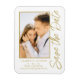 Save The Date White Gold Script élégant Le Magnet Mariage moderne dispose d'un arrière - plan blanc avec votre photo personnalisée. Personnalisez avec votre texte en modifiant le texte dans les zones de texte fournies. Conçu pour vous par ©Evco Studio www.zazzle.com/store/evcostudio