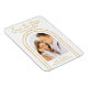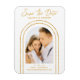 Save The Date White Gold Stylish Script Art Déco Mariage Magnet présente votre photo préférée dans une arche dorée sur un arrière - plan blanc. Personnalisez avec votre texte en modifiant le texte dans les zones de texte fournies. Conçu pour vous par ©Evco Studio www.zazzle.com/store/evcostudio