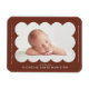 Magnet de faire-part de naissance moderne comportant la photo de votre bébé nichée dans un encadré marron à bordure festonnée. Personnalisez le magnet de faire-part de naissance marron en ajoutant le nom de votre bébé et des informations supplémentaires en lettrage blanc.