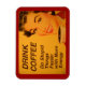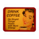Femme souriante avec rouge à lèvres rétro et ongles boit sa tasse de café du matin. La légende dit : "Buvez du café - Faites des choses stupides plus vite avec plus d'énergie."