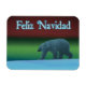Un ours polaire arpente la glace pendant la longue nuit polaire; les aurores boréales en rouge et vert au loin. Le texte espagnol "Feliz Navidad" apparaît en bleu et blanc éclatant.