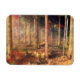 Des rayons de soleil d'automne chauds jettent un oeil à travers les arbres jaunes et rouges au bord des bois et égayent les feuilles tombés sur le sol de la forêt. Plus profond dans la forêt où les ombres sont plus sombres, il y a encore des aperçus d'or et de pourpre.