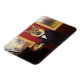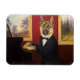 Ce design présente German Shepherd élégamment vêtu d'un manteau de grenouille noire, chemise blanche, près du piano, contre un mur rouge avec des peintures dans des cadres dorés.