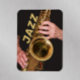 Pour les amateurs de jazz ! 3 x 4 pouce, flexible, aimant décoratif pour la maison ou le bureau qui comprend une photo d'un jazzman jouant sa corne de saxophone ténor usée, de couleur or, avec le mot "JAZZ" imprimé en lettres-blocs de couleur or.
