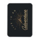 Aimant flexible avec illustration de couleur or sur un arrière - plan gris-noir. Conçu avec une illustration d'une montagne avec les rayons de soleil brillant vers l'extérieur de derrière. La typographie dit : La vie est une aventure explorer la découverte de rêve.