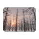 Un soleil d'hiver pâle se couche derrière des mélèzes imposants comme des sentinelles sombres. Leurs branches grillées, nues, sauf pour un piqué de neige, et les dorures pastel, roses et bleus du ciel couché de soleil sont vus comme à travers une brume rêveuse. Au premier plan, les flocons de neige tombent doucement.