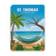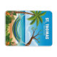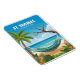 Un hamac à rayures surplombe une branche de palmiers sur une plage de sable avec l'océan et le ciel en arrière - plan.