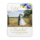 Vos invités aimeront cette beauté naturelle et aquarelle. De la Carolina Blue Collection, cette présentation romantique estivale a un modèle photo en face au milieu. Le texte Love and Thanks entoure la photo, et les noms mariés et les modèles de date sur le devant sous la photo. Un bouquet fleuri en haut à droite présente de multiples couleurs de bleu, jaune et violet, avec des feuilles verts et or.