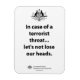 Soyons raisonnables ! En coque d'une menace terroriste, quelle est la probabilité que cela ait un impact réel sur nos vies, à part la peur des médias qui nous effrayera, ce qui fera que les politiciens ôteront nos droits au nom de la sécurité ?