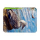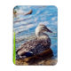Une photo d'une femelle canard colvert debout dans la zone peu profonde d'un étang, avec des ondulations s'éloignant d'elle dans un mouvement circulaire. Copyright Kimberly J Tilley.