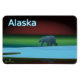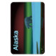 Un ours polaire arpente la glace pendant la longue nuit polaire; les aurores boréales en rouge et vert au loin. Le texte "Alaska" en bleu et blanc brillant apparaît également.