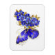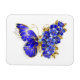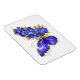 Bijoux, bleu, saphir, papillon aux fleurs pétillantes avec aile décorée de bleu, fleurs précieuses avec feuilles d'or sur arrière - plan blanc.