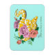 Un Python albino jaune se déplace autour de roses roses et pêche dans un arrière-plan turquoise.