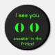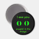 Das ist ein runder, schwarzer Kühlschrankmagnet mit neon-grünen Augen darauf und den Worten "Ich sehe dich, nicken im Kühlschrank!" Niedlicher Gothspass, der sich gut mit Halloween mischt. Gotta behielt Kontrolle mit all diesen geilen dunklen Leckereien da drin.