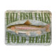 Ein dekorativer Magnet für den Fischer in deinem Leben. "Hoch erzählte Fischgeschichten hier" mit einem detaillierten Bild einer Regenbogenforelle auf einem rustikalen Hintergrund aus verwittertem Holz.