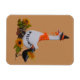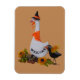 Die Gans mit orangefarbenem Kicherhahn sitzen inmitten von herbstlichen Akzenten, neben Blackbird. Schwarzer Hut auf Gans hat orangefarbene Bänder. Gelbe und orangefarbene Sonnenblumen stehen unter grünen Blätter.