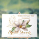 Watercolor Magnolia Lila florales Brautparty Willkommen Akryllisches Zeichen bietet elegante Aquarellfarben magnolia Blume in sanften Lavendel und lila mit grünen Blätter auf einem weißen Hintergrund mit goldenem Akzent mit Ihrem Brautparty Willkommenszeichen unten. Für Sie entworfen von Evco Studio www.zazzle.com/store/evcostudio